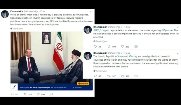 Twitter üzerinden verdiği mesajlarda Hamaney, "İslam'ın dünyadaki en önemli ihtiyacı bugün, yakınlık ve büyümedir. Müslüman ülkeler arasındaki işbirliği, bölgedeki problemleri çözmeyi kesinlikle kolaylaştırmaktadır; bu nedenle, kibirli güçler, özellikle ABD, Müslüman ülkeler arasındaki işbirliğinden, bir İslami gücün oluşmasından rahatsız oluyor. İran ve Türkiye, bölgenin iki onurlu ve güçlü ülkesidir ve İslam Dünyası için karşılıklı motivasyonları vardır; bu nedenle, iki ulusun siyaset ve ekonomi arenasındaki işbirliği, öncekinden daha fazla genişlemelidir" dedi.